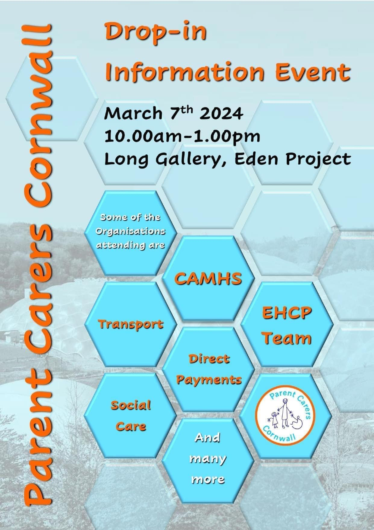 Join Parent Carers Cornwall at their Drop-in Information Event on March 7th, 2024, from 10 am to 1 pm at the Long Gallery, Eden Project.